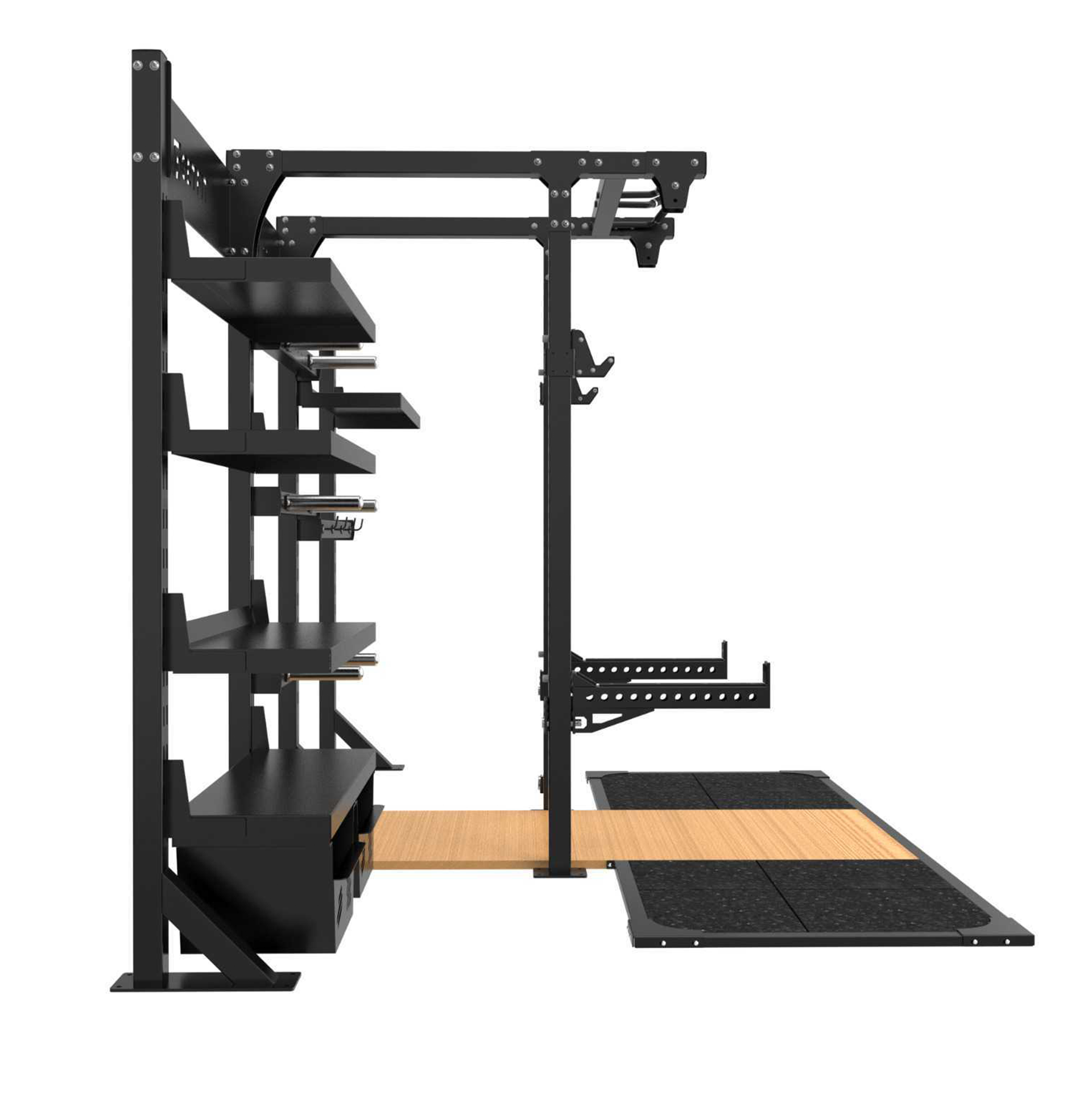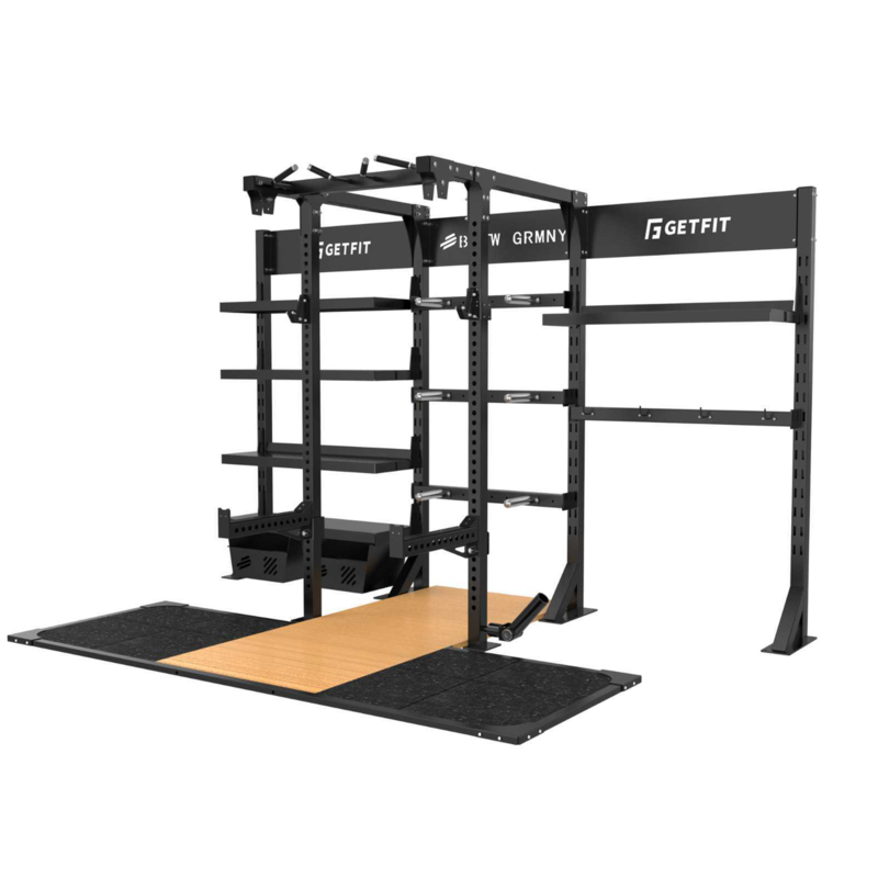 Durch die klare Struktur bleiben alle Trainingsgeräte jederzeit griffbereit, was den Trainingsfluss verbessert und die Fläche optisch aufgeräumt hält. Das Rack eignet sich ideal als zentrale Einheit in Functional Areas, Powerlifting-Zonen oder Cross-Training-Bereichen.